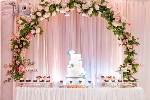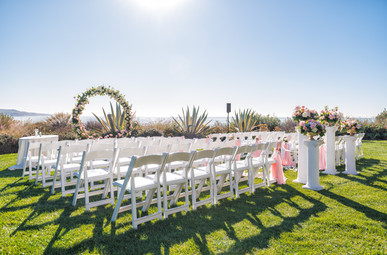 Wesley and Rikki reached out to us after they have found the perfect venue for their wedding - Terranea Resort in Rancho Palos Verdes. This was a fun wedding to design. We spent a lot of time at rental places playing with colors, materials, and textures of tabletop rentals with the bride. We absolutely loved all the details from the pattern of the table overlay to the roses floating in the sweetheart table chiffon cloud. The best part was transforming a regular conference room into a classy and elegant space for our clients by putting in the white seamless floor with a custom made decal, draping all around the room and on the ceiling. This fall wedding (October) turned out amazing and it was an absolute treat to work with this amazing couple!